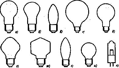 колбы которых могут иметь самую разнообразную форму и по-разному перераспределять световой поток; лампы малых размеров с малым цоколем (миньон), шаровые или Свечеобразные колбы которых могут быть прозрачными или опаловыми; лампы с декоративной колбой с рифлением «под хрусталь», разнообразные зеркальные лампы (рис. 2).